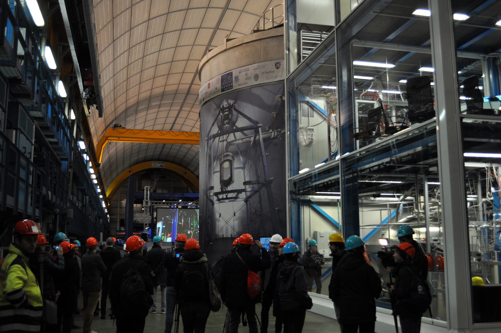 The inauguration was attended by the XENON scientists along with guests from funding agencies as well as journalists and colleagues. About 80 visitors were able to join the ceremony directly at the experimental site in the 100 m-long, 20 m-wide and 18 m-high hall B of LNGS, which is itself below 1 400m of rock. Here, the new XENON1T instrument is installed inside a 10 m-diameter water tank to shield it from radiation which originates from the environment. Even more guests followed the introductory presentations in the LNGS auditorium, where Elena Aprile, Professor at Columbia University (New York) and founder of the XENON project, illustrated the evolution of the XENON program from the early beginnings with a 3 kg detector 15 years ago to the present-day instrument XENON1T with a total mass of 3 500kg.